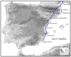 Segons Polibi, Anníbal va creuar el territori dels ilergets, bargusis i andosins fins als Pirineus, evitant els pobles costaners. Probablement va fer-ho així per tal d’evitar els pobles indígenes més afins als romans i als grecs d’Emporion i Rhode, que haurien dificultat més la seva marxa. A més, gran part de la seva estratègia per derrotar els romans passava per aconseguir la desafecció dels seus aliats, entre ells les ciutats gregues del sud de la península itàlica. De fet, és possible que el famós tractat entre romans i cartaginesos del 226 aC, que situava la frontera de les respectives zones d’influència en el riu Ebre, respongués als desitjos i preocupacions de Massàlia i les colònies gregues d’Ibèria, que veien perillar la seva influència sobre els pobles ibèrics al nord del riu enfront de l’expansionisme cartaginés.