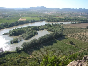 El gual del mas de Molló sobre el riu Ebre, vist des del poblat ilercavó del Castellet de Banyoles. En segon terme, el camí cap a les terres de l’interior, el territori ausetà, al fons. |