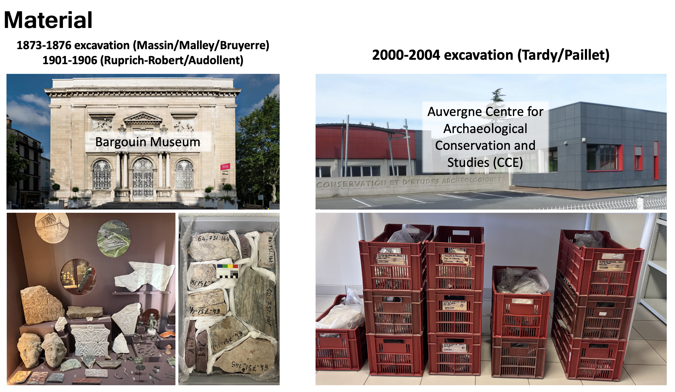 Aquest projecte es va posar en marxa a iniciativa de Bertrand Dousteyssier, en el marc de la seva càtedra Arvernes 2.0. Té com a objectiu reprendre l’estudi de les pedreres regionals de marbre potencialment emprades en l’edifici i assegurar la correcta identificació de les roques d’importació llunyana documentades, procedents principalment del nord d’Àfrica, d’Itàlia, de Grècia i de Turquia.